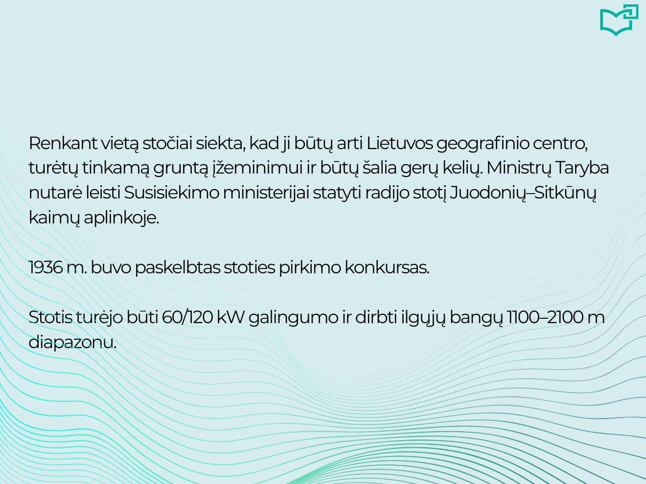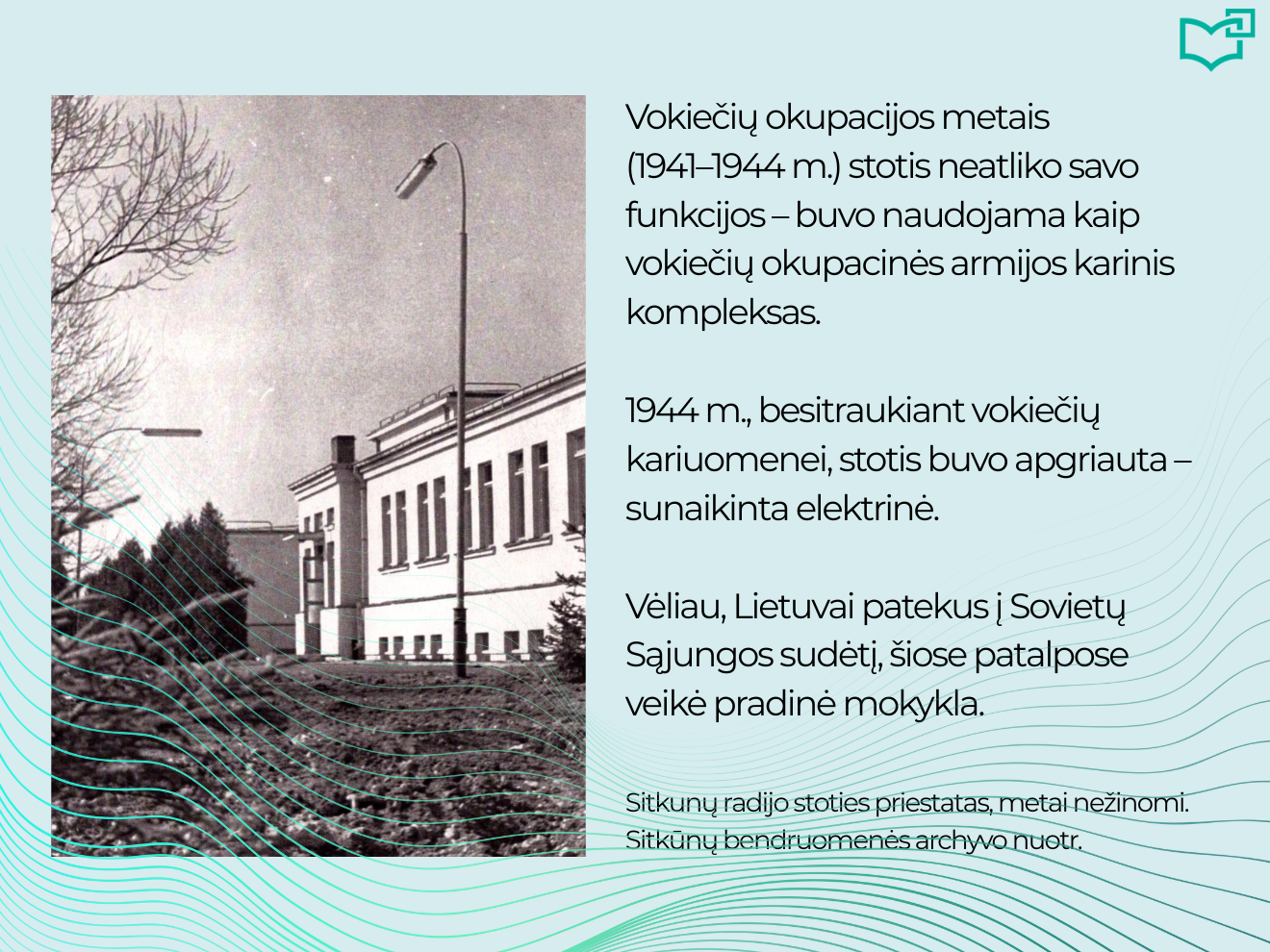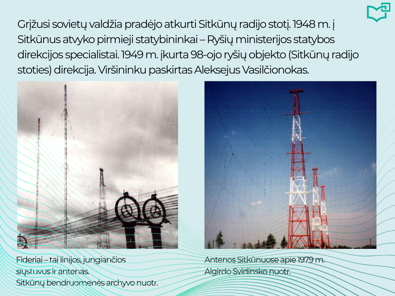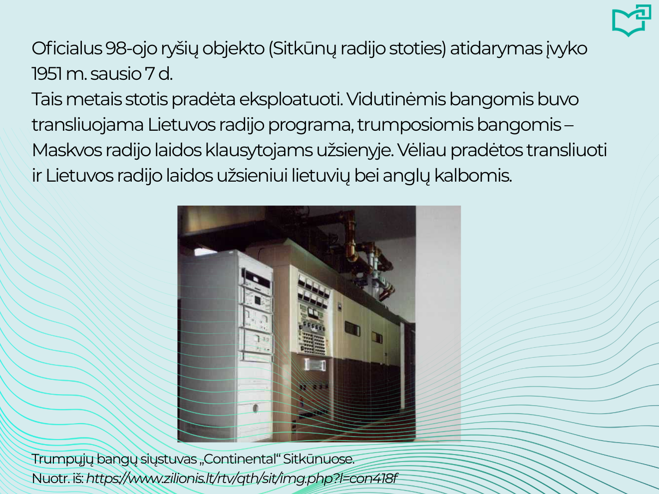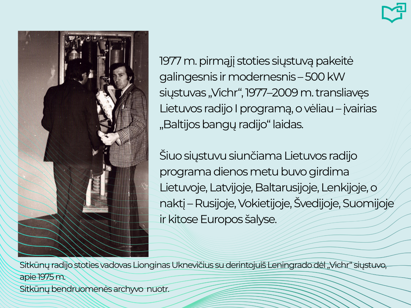 Radijas – vis dar populiariausia žiniasklaidos priemonė pasaulyje! Devyni iš 10 suaugusiųjų kiekvieną savaitę klausosi radijo. Nuo pirmųjų elektromagnetinių bangų atradimo 1873 m. iki šiandien radijas jungia žmones visame pasaulyje. Aplankykite virtualią parodą ir atraskite įdomią Lietuvos radijo istorijos dalį – Sitkūnų radijo stoties palikimą.