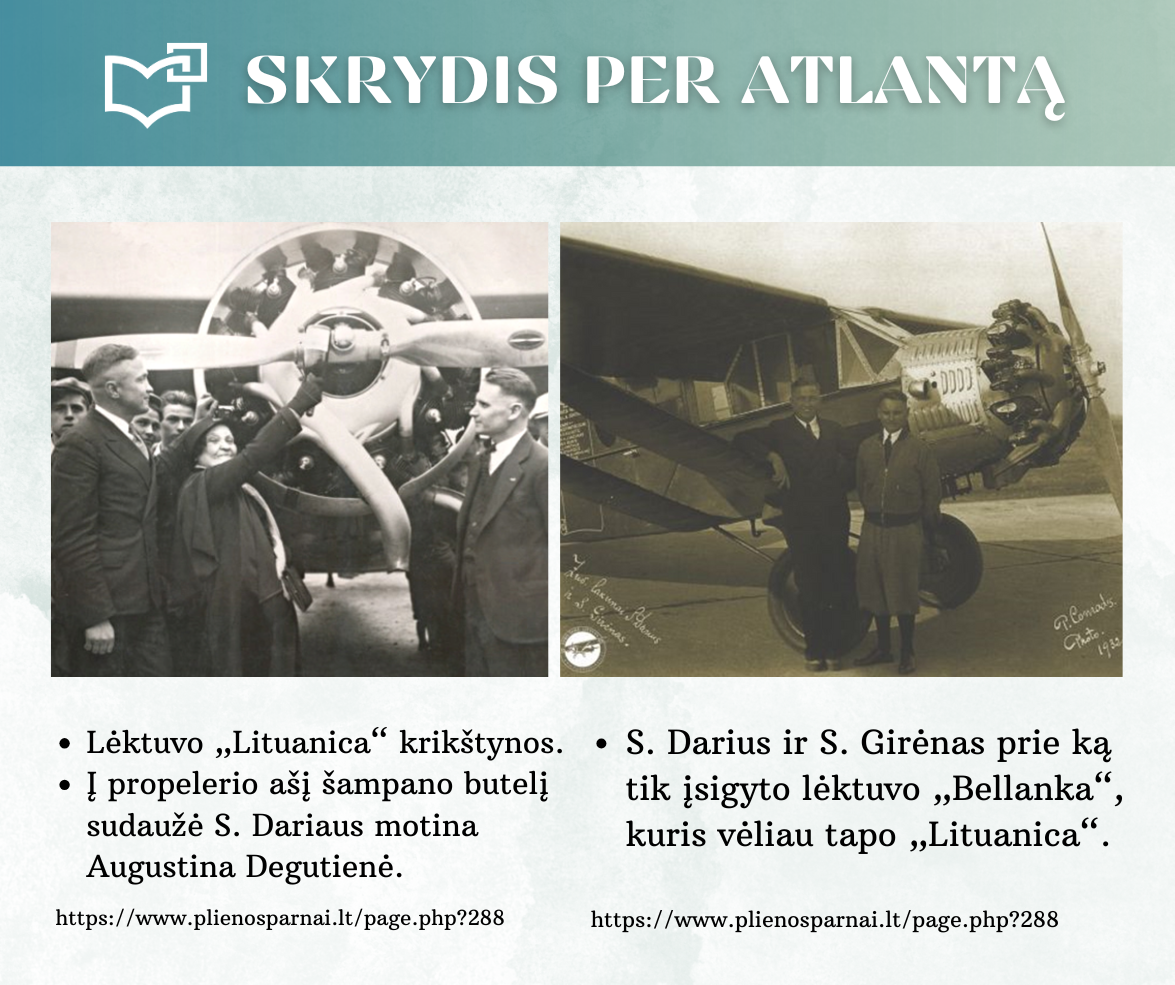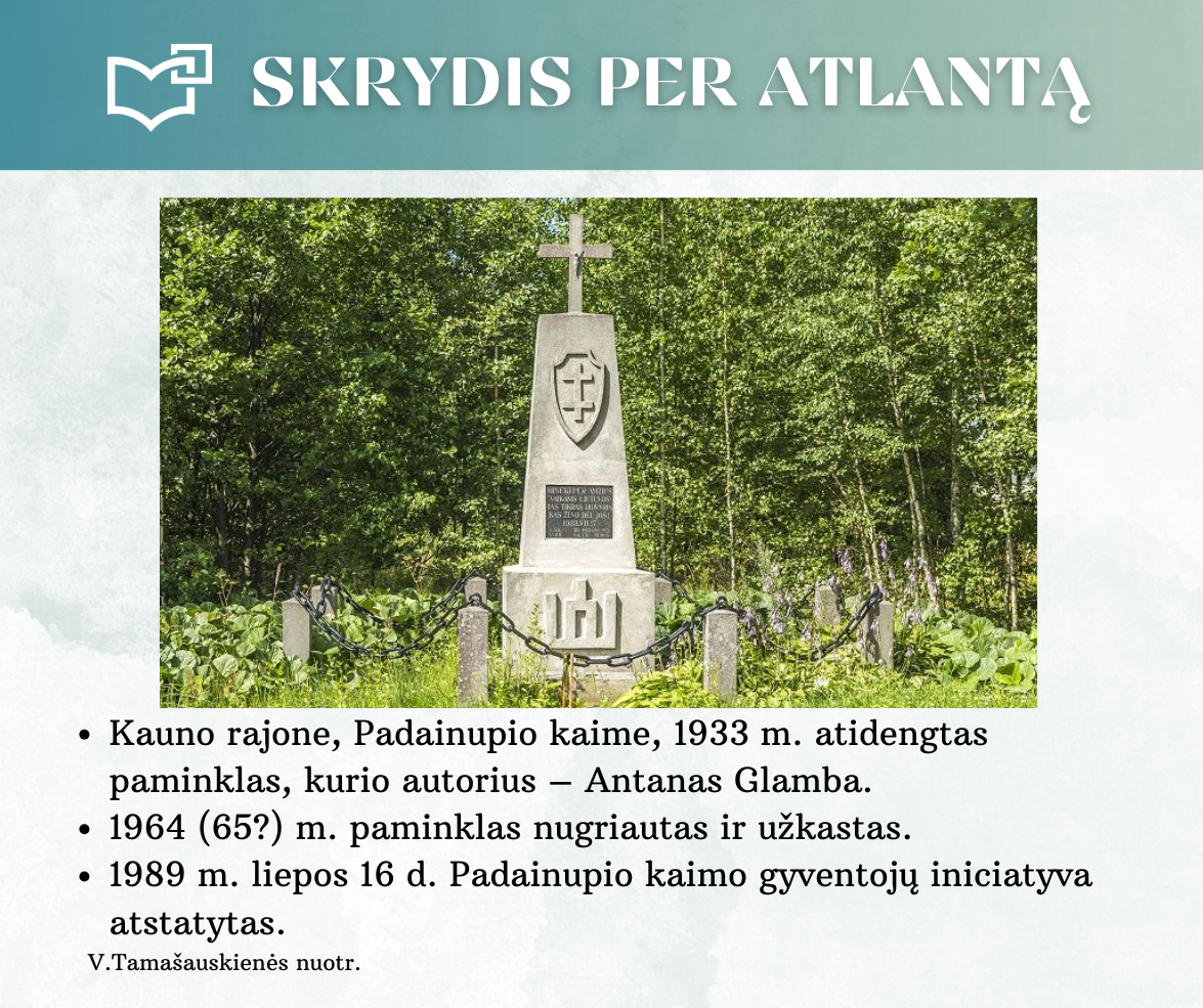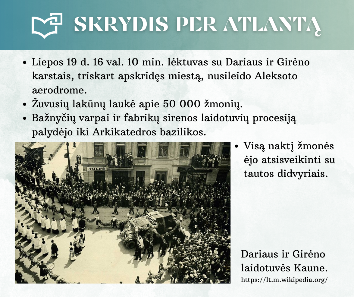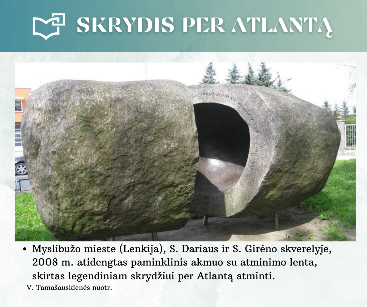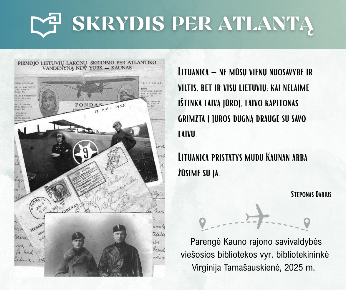 „Skrydis per Atlantą“ – Kauno rajono savivaldybės viešosios bibliotekos vyr. bibliotekininkės Virginijos Tamašauskienės parengta virtuali paroda, skirta legendiniam „Lituanicos“ skrydžiui pagerbti. 1933-iųjų liepos 15-osios ankstyvą rytą, 6 val. 24 min. Steponas Darius ir Stasys Girėnas pakilo iš Niujorko, kad nenutūpę įveiktų apie 7200 km ir pasiektų Kauną. Virtualioje parodoje pristatome didvyrius, kurie sujungė du žemynus. Šią herojišką istoriją, neabejojame, žino kiekvienas lietuvis, bet nepraleiskite galimybės atrasti naujų faktų ar nuotraukų. Pilotų žygdarbis tapo pasaulio lietuvius vienijančiu simboliu, neatsiejamu nuo tautinio sąmoningumo.