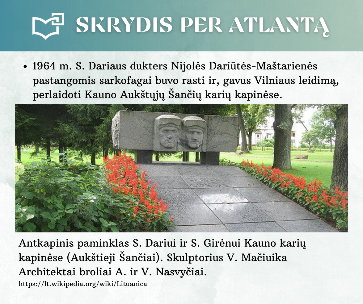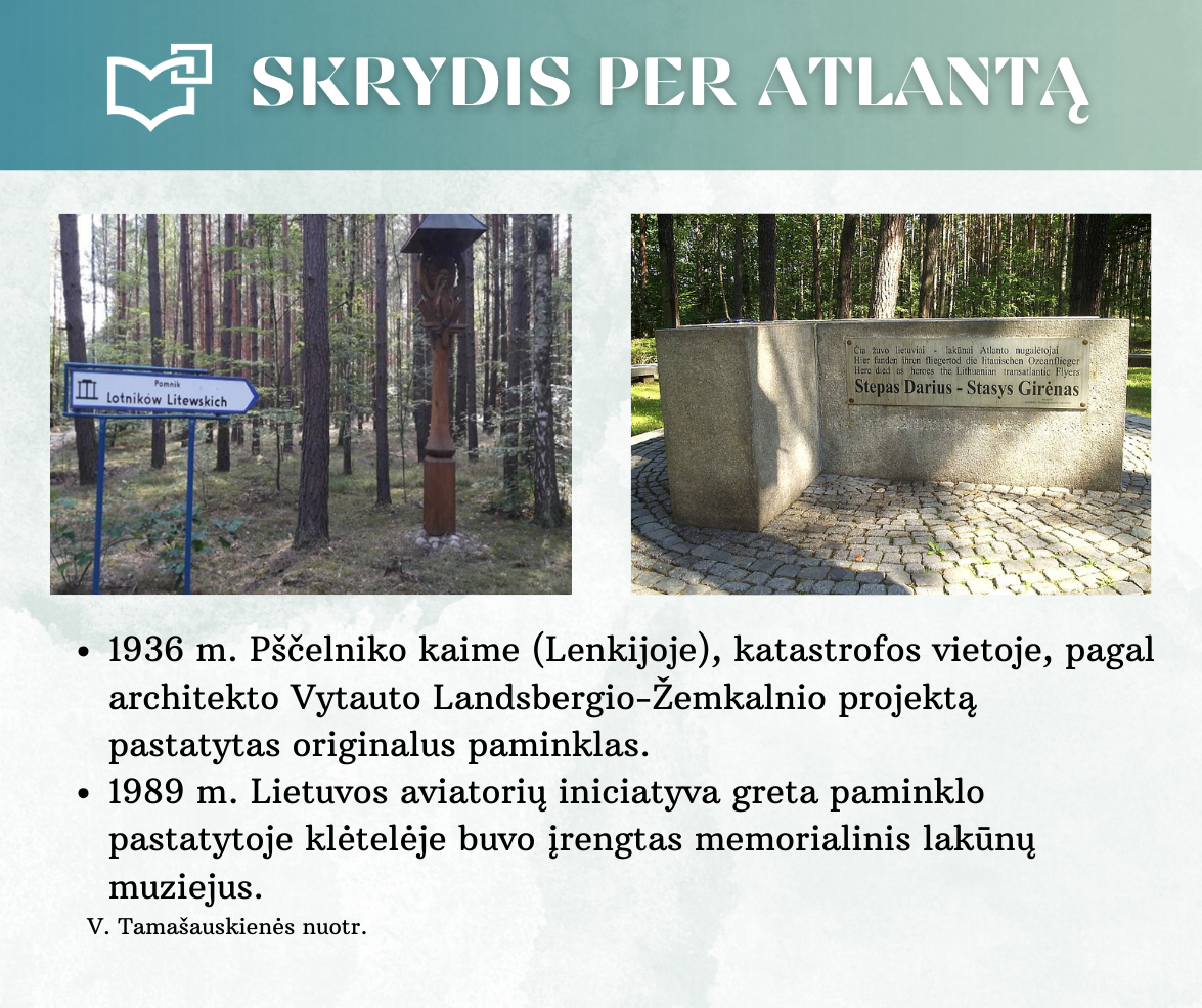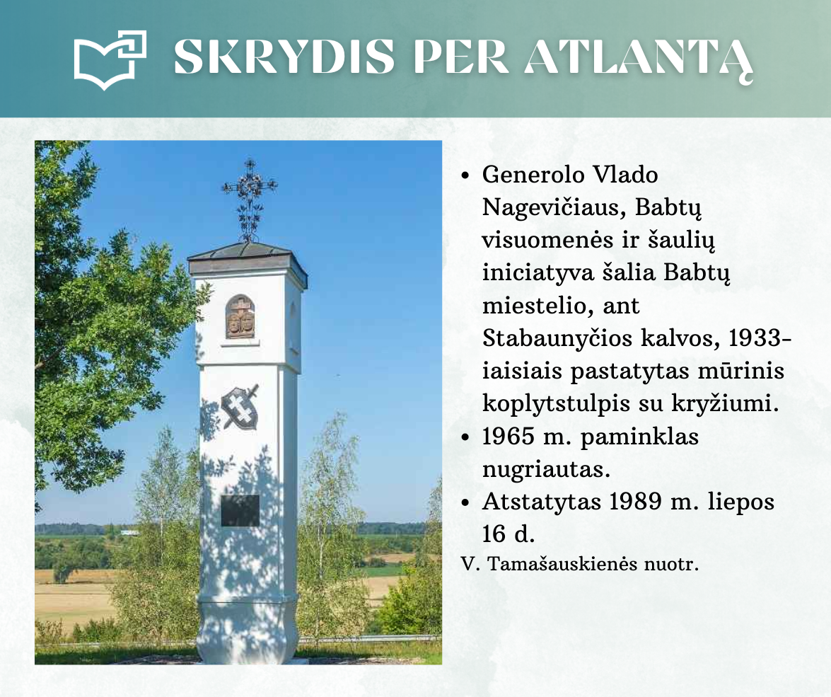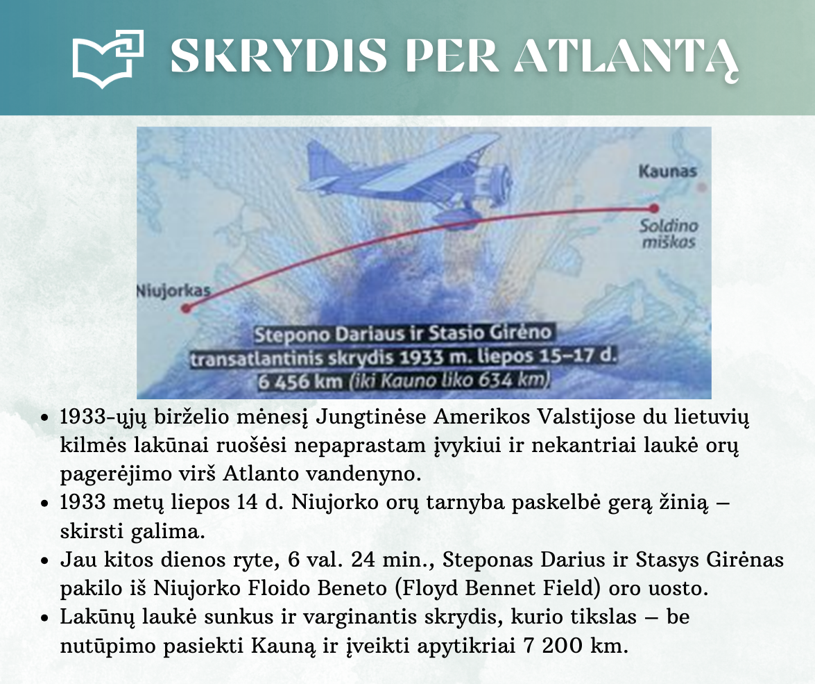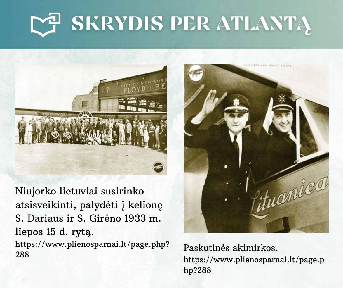 „Skrydis per Atlantą“ – Kauno rajono savivaldybės viešosios bibliotekos vyr. bibliotekininkės Virginijos Tamašauskienės parengta virtuali paroda, skirta legendiniam „Lituanicos“ skrydžiui pagerbti. 1933-iųjų liepos 15-osios ankstyvą rytą, 6 val. 24 min. Steponas Darius ir Stasys Girėnas pakilo iš Niujorko, kad nenutūpę įveiktų apie 7200 km ir pasiektų Kauną. Virtualioje parodoje pristatome didvyrius, kurie sujungė du žemynus. Šią herojišką istoriją, neabejojame, žino kiekvienas lietuvis, bet nepraleiskite galimybės atrasti naujų faktų ar nuotraukų. Pilotų žygdarbis tapo pasaulio lietuvius vienijančiu simboliu, neatsiejamu nuo tautinio sąmoningumo.