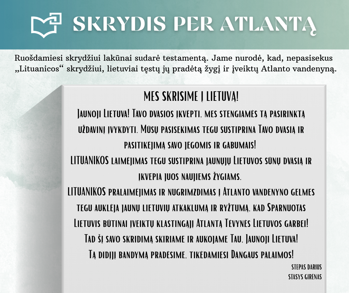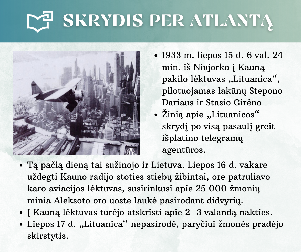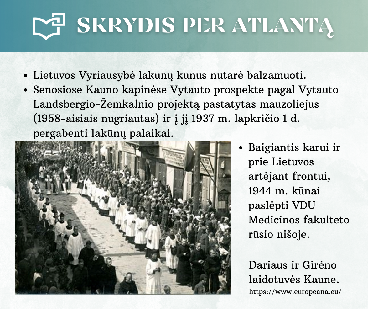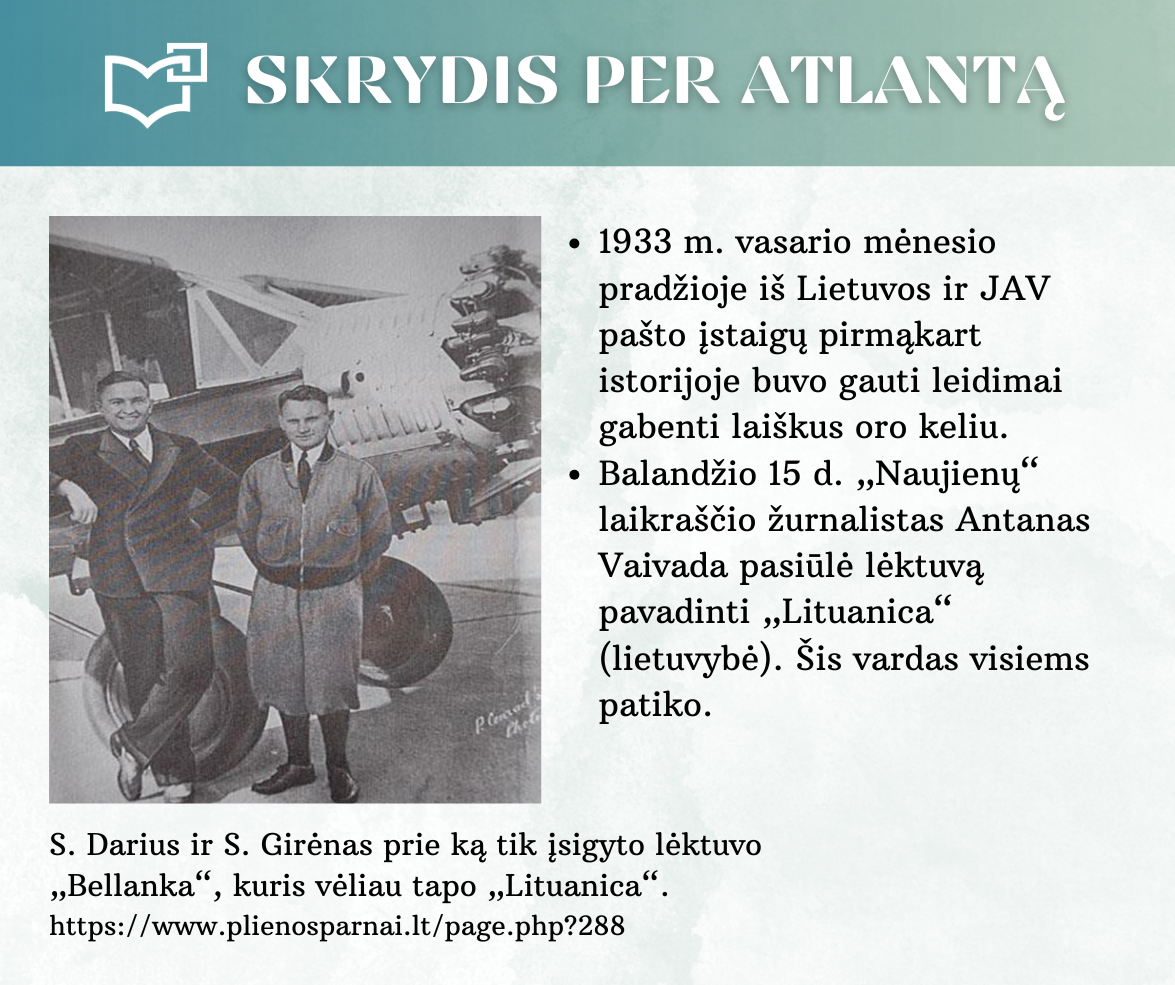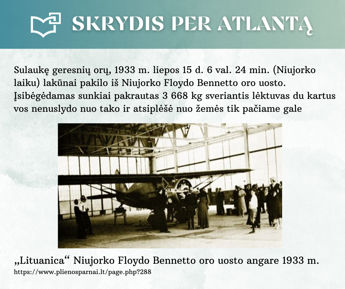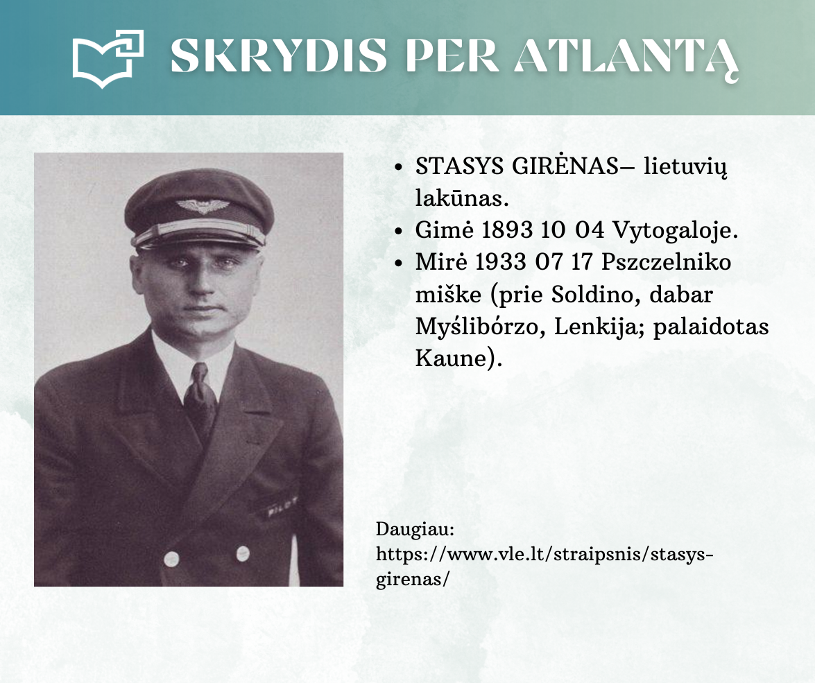 „Skrydis per Atlantą“ – Kauno rajono savivaldybės viešosios bibliotekos vyr. bibliotekininkės Virginijos Tamašauskienės parengta virtuali paroda, skirta legendiniam „Lituanicos“ skrydžiui pagerbti. 1933-iųjų liepos 15-osios ankstyvą rytą, 6 val. 24 min. Steponas Darius ir Stasys Girėnas pakilo iš Niujorko, kad nenutūpę įveiktų apie 7200 km ir pasiektų Kauną. Virtualioje parodoje pristatome didvyrius, kurie sujungė du žemynus. Šią herojišką istoriją, neabejojame, žino kiekvienas lietuvis, bet nepraleiskite galimybės atrasti naujų faktų ar nuotraukų. Pilotų žygdarbis tapo pasaulio lietuvius vienijančiu simboliu, neatsiejamu nuo tautinio sąmoningumo.