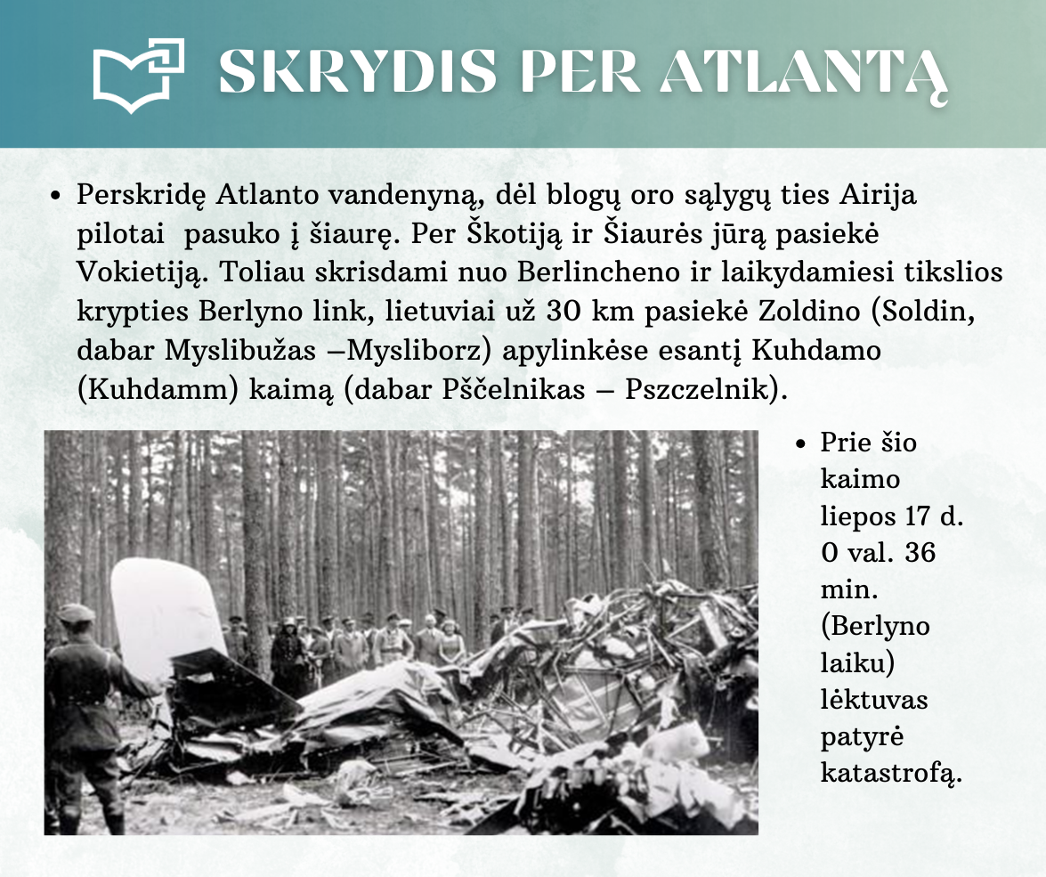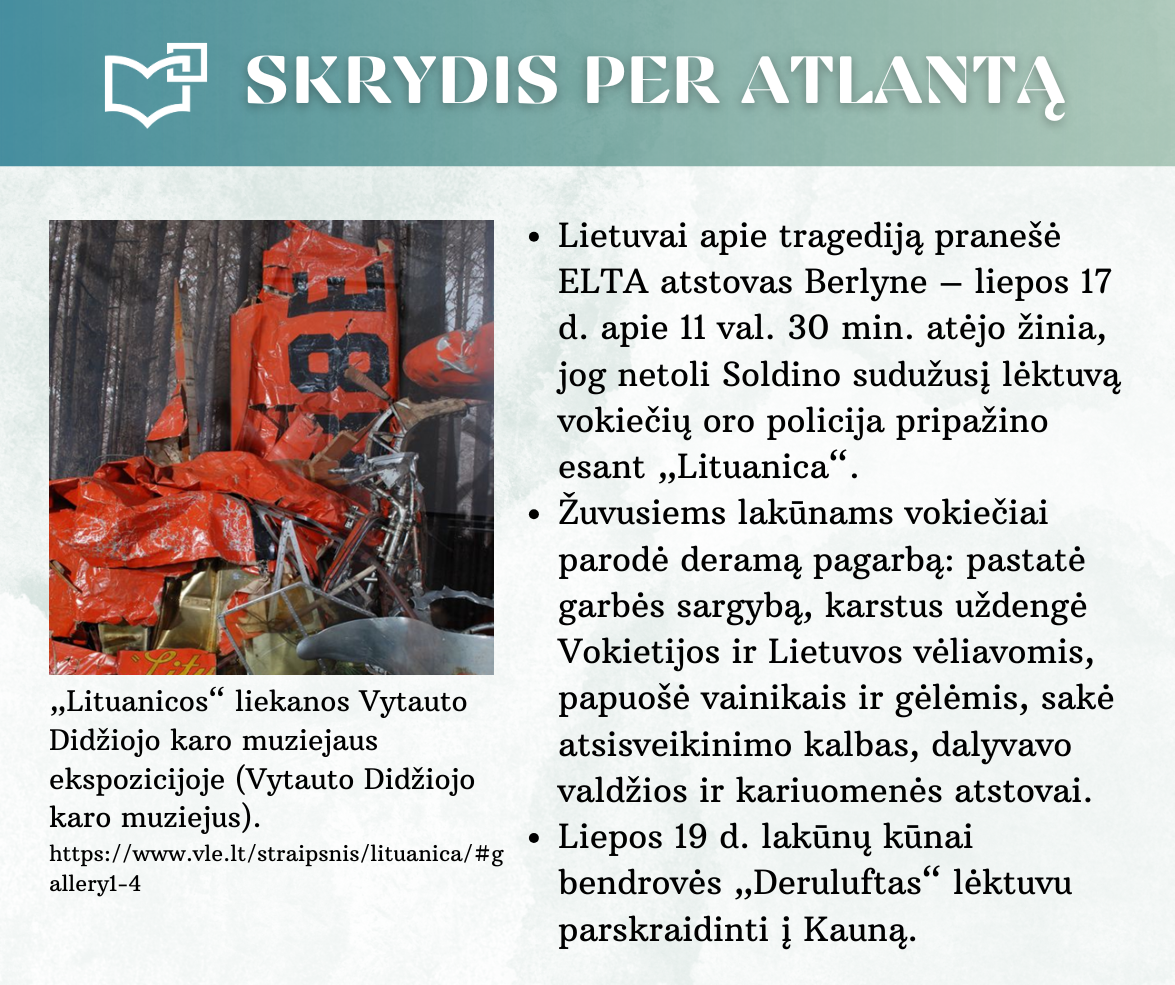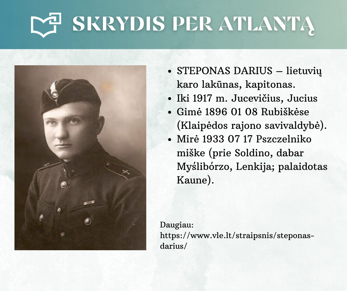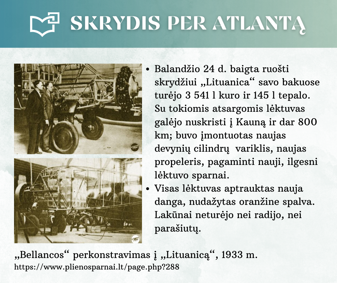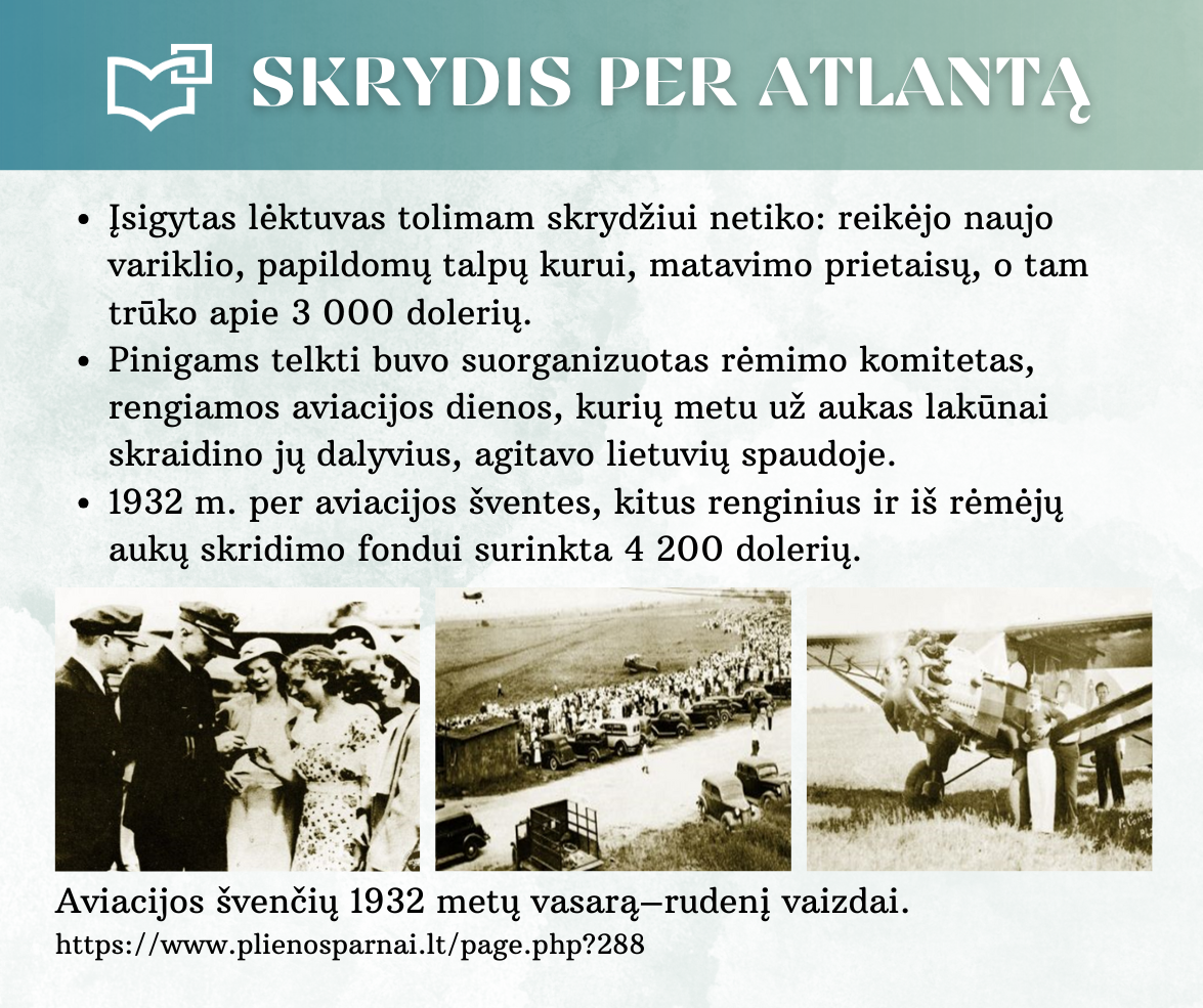 „Skrydis per Atlantą“ – Kauno rajono savivaldybės viešosios bibliotekos vyr. bibliotekininkės Virginijos Tamašauskienės parengta virtuali paroda, skirta legendiniam „Lituanicos“ skrydžiui pagerbti. 1933-iųjų liepos 15-osios ankstyvą rytą, 6 val. 24 min. Steponas Darius ir Stasys Girėnas pakilo iš Niujorko, kad nenutūpę įveiktų apie 7200 km ir pasiektų Kauną. Virtualioje parodoje pristatome didvyrius, kurie sujungė du žemynus. Šią herojišką istoriją, neabejojame, žino kiekvienas lietuvis, bet nepraleiskite galimybės atrasti naujų faktų ar nuotraukų. Pilotų žygdarbis tapo pasaulio lietuvius vienijančiu simboliu, neatsiejamu nuo tautinio sąmoningumo.