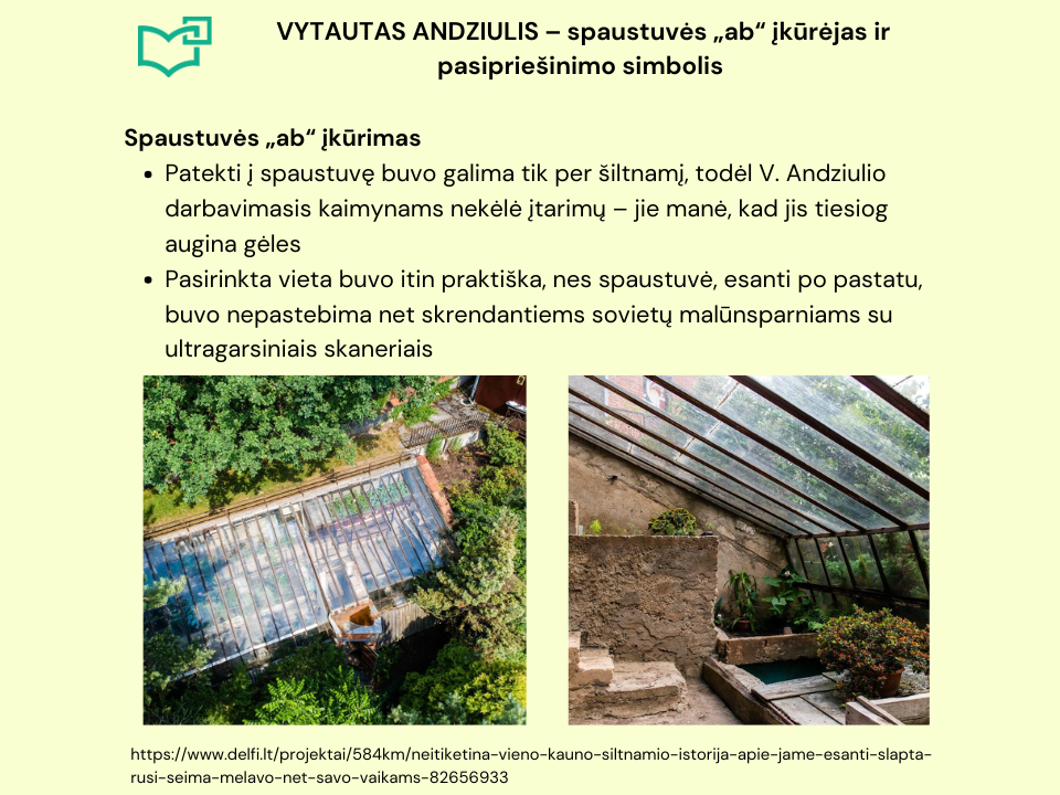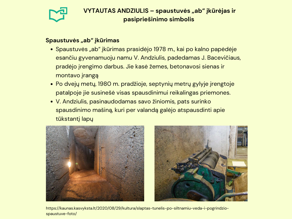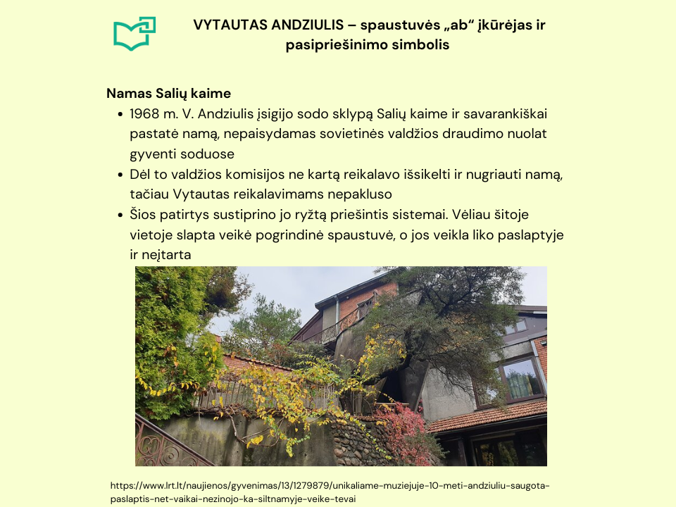 Kauno rajono Salių kaime net dešimt metų nesusekta veikė pogrindinė spaustuvė. Jos įkūrėjai Vytautas Andziulis ir Juozas Bacevičius savo darbu kovojo prieš okupacinės valdžios skleistą propagandą ir siekė, kad nebūtų galutinai sunaikintos mūsų tautos dvasinės vertybės. Šiandien spaustuvėje įkurtas muziejus, kuriame galite rasti iškiliosios spaudos įrangos pavyzdžių, antinacinės ir antisovietinės kovos dokumentų kopijų, pogrindinės spaudos leidiniių, rezistentų nuotraukų. Spaustuvė „ab“ yra įtraukta į tarptautinį istoriškai vertingų šaltojo karo įrenginių ir vietovių sąrašą. Nuo 1997 m. ji yra Kaune veikiančio Vytauto Didžiojo karo muziejaus padalinys.