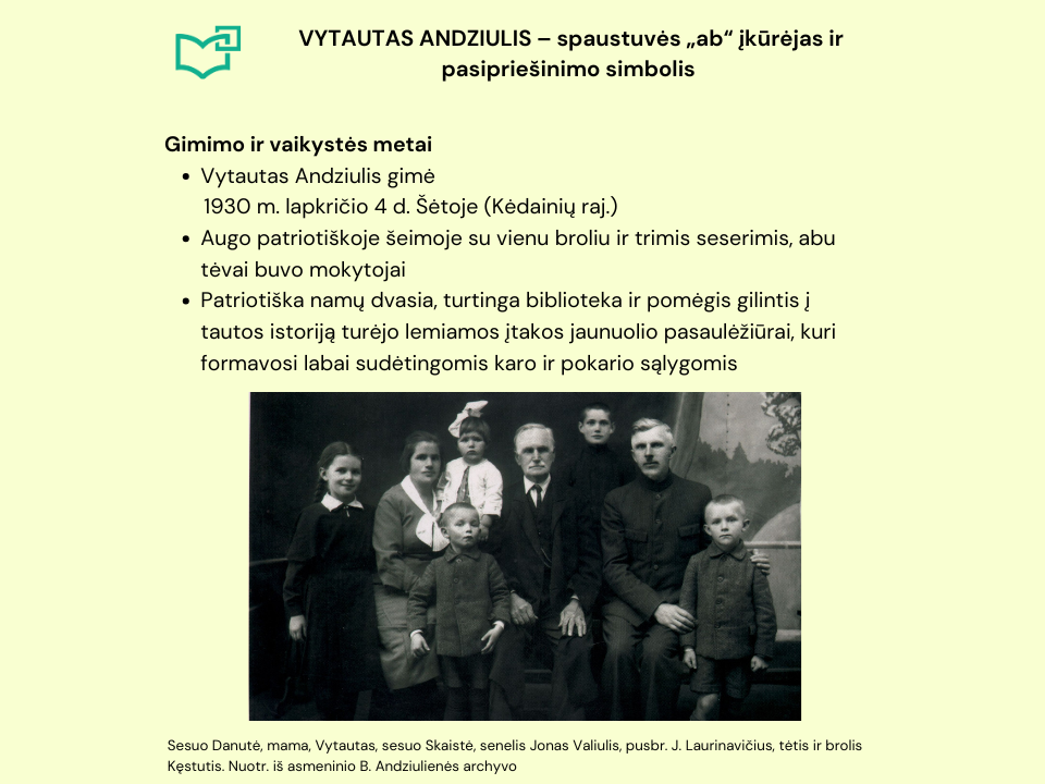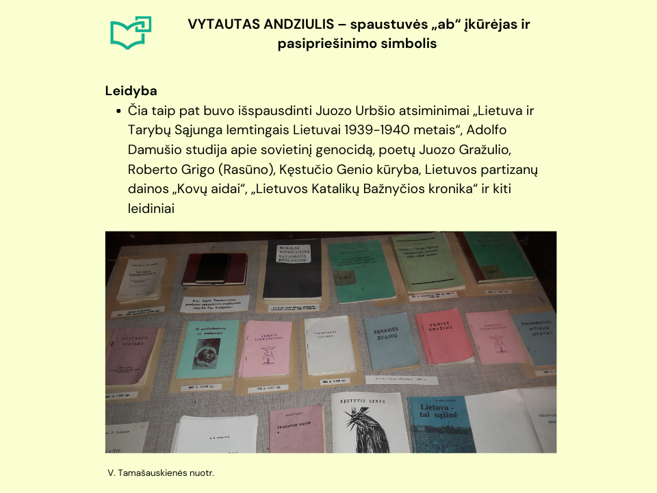 Vyr. bibliotekininkės Virginijos Tamašauskienės parengta virtuali paroda pasakoja nelengvų iššūkių kupiną spaustuvės steigėjo gyvenimo kelią, drąsius pasirinkimus, svariai prisidėjusius prie lietuvybės puoselėjimo Kauno rajone ir ne tik. Paroda skirta V. Andziulio 96-osioms gimimo metinėms paminėti. Kviečiame skaityti.